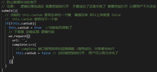 防止数据抖动的方法 数据抖动 说白了 就是 一个按钮有一个事件 然后用户在很短的事件内重复点击 类似的有 购买物品 提交完成按钮 这些