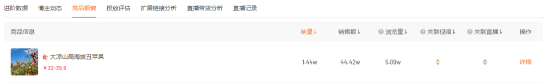 比如在乡村黑妹的【商品橱窗】,可以看到‘大凉山高海拔丑苹果’预估销量1.44万、预估销售额44.42万。
