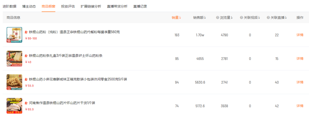 随着视频号数据逐渐稳定,直播带货品类也不断丰富,在【友望数据】-【商品橱窗】中选择【直播推广商品】可以看到该账号不仅售卖现挖的新鲜山药,还有山药粉、山药片、山药粉条、山药小麻花等等。