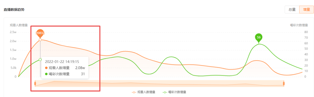 在【直播监控】-【直播数据趋势】中可以看到在1月22日的一场直播中仅4分钟,观看人数增量就达到了2万。