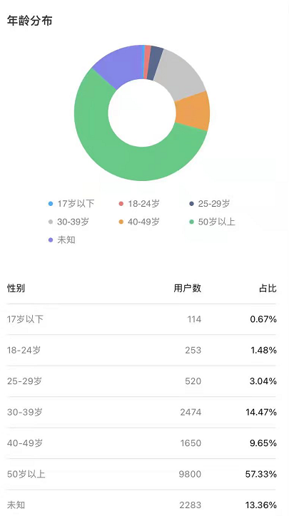 目前彦凯生鲜账号粉丝数1.7万,从年龄分布中可以看到该账号关注群体50岁以上人群占比最高57.33%,其次是30-39岁,占比14.47%。