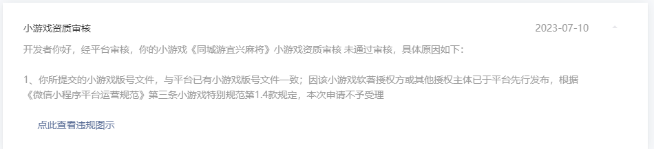 请问一下,提审被拒提示: 你所提交的小游戏版号文件,与平台已有小游戏版号文件一致;因该小游戏软著授权方或其他授权主体已于平台先行发布,根据《微信小程序平台运营规范》第三条小游戏特别规范第1.4款规定,本次申请不予受理