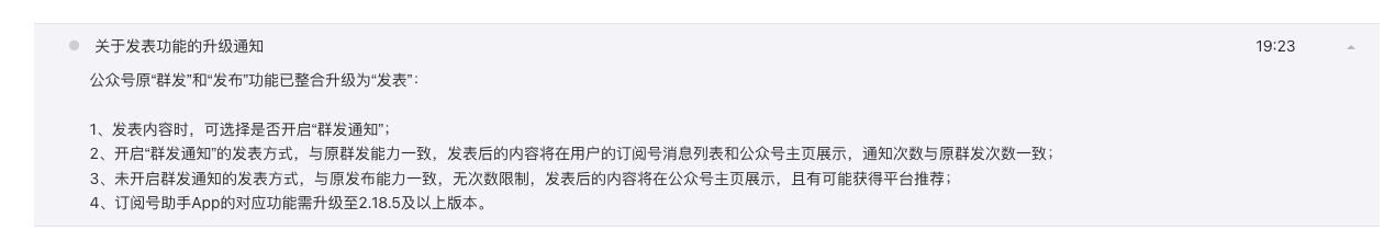 没有收到有关更新发表的消息是为什么呀?现在还是显示的群发或发布