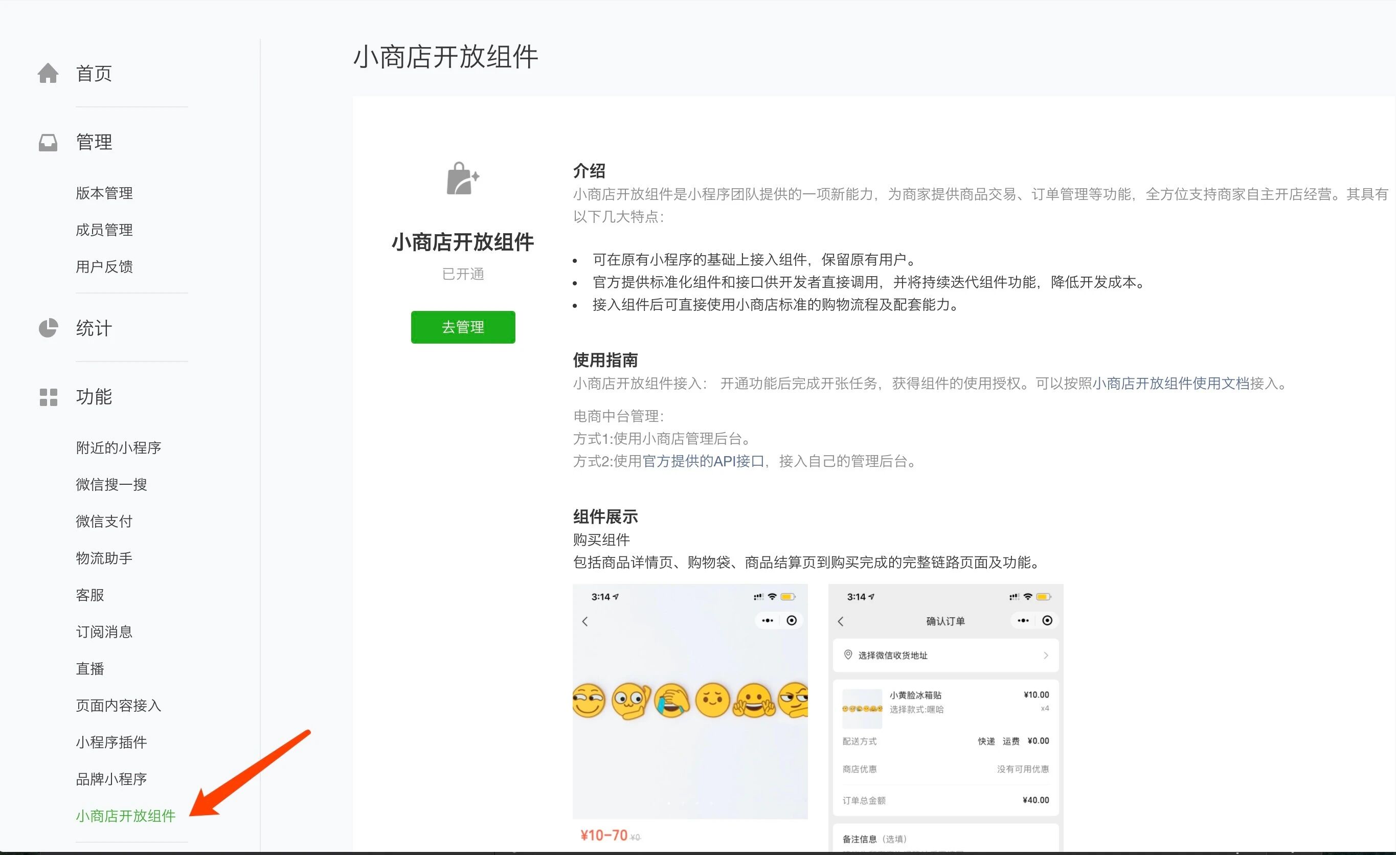 点击去管理会打开对应小程序的小商店后台,此后台是对应你小程序申请的插件版小店后台 与 单独申请的小店后台不互通,需要单独提交资质审核签约