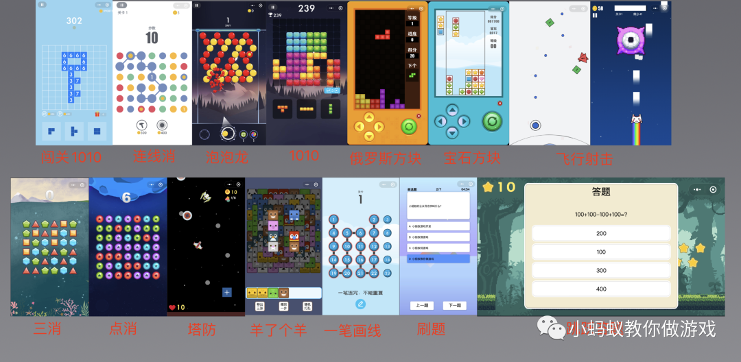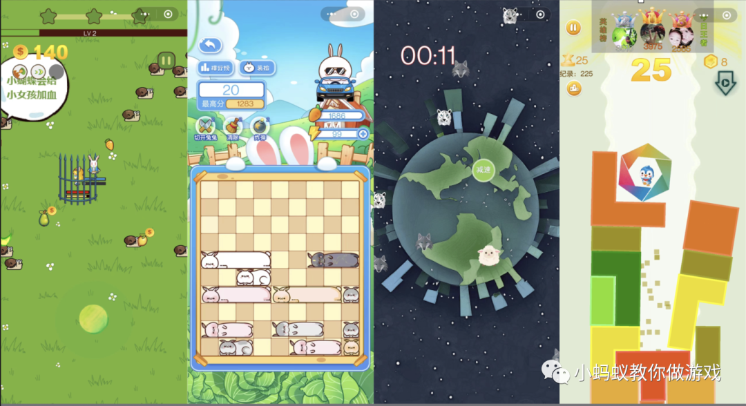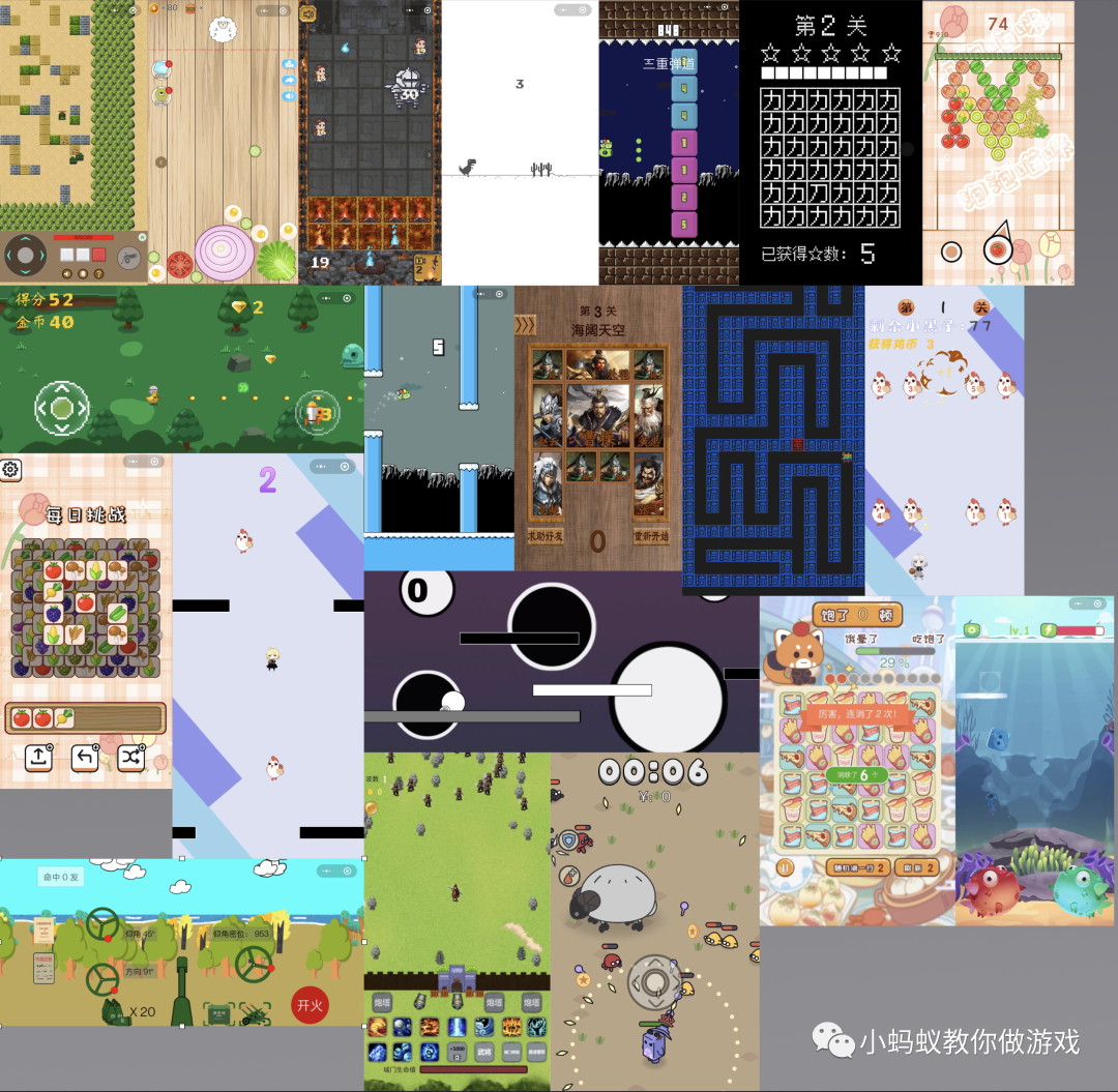 微信小游戏制作工具都能够做哪些类型的游戏呢?这是不少新手疑惑的问题。下面我就从官方示例,小蚂蚁的上线游戏,小蚂蚁学员的上线游戏三个方面,来展示一下微信小游戏制作工具目前所能制作的游戏类型。