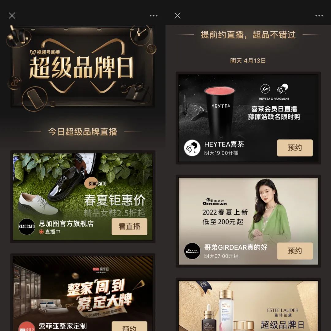 近日,友望数据发现,视频号开启了超级品牌日活动,飞利浦、思加图、索菲亚、百思图、喜茶、雅诗兰黛、哥弟、中国珠宝、途牛旅游等几十个不同品类的品牌商家参与。