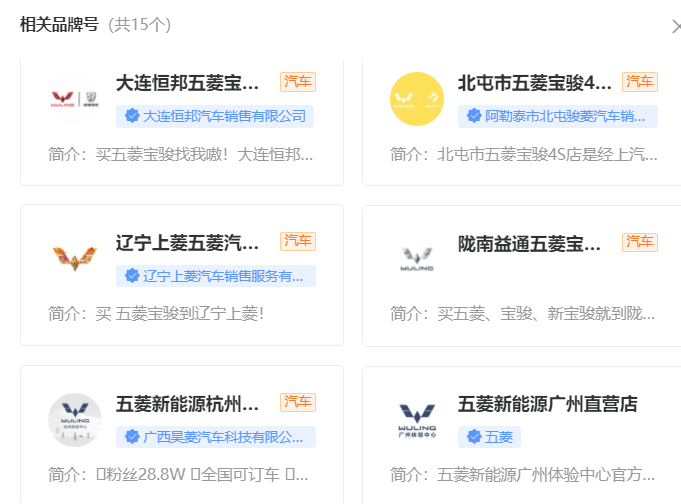 通过友望数据【品牌搜索】发现,五菱相关品牌号至少有15个,都是各地区的直营店开设的官方账号。