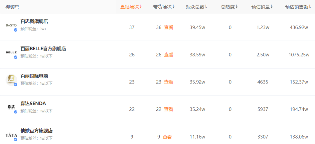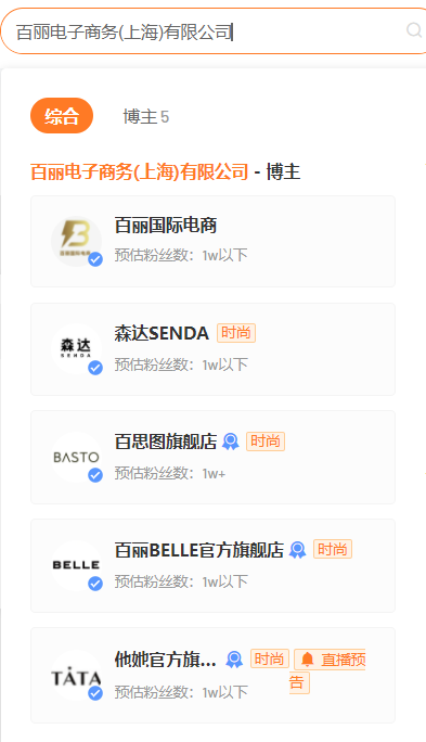 我们通过友望数据搜索发现,以“百丽电子商务(上海)有限公司”认证的账号近期活跃的至少有5个,都是百丽集团旗下的品牌号。