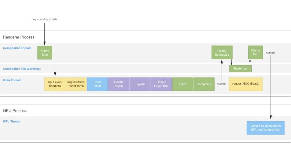 - Frame End. 合成器线程已经完成paint和composite的工作,这时会发送一个commit给GPU进程,告诉他可以进行draw了,同时会传达主线程一个commit done,如果一个帧中视觉的变化没有主线程参与,这里合成器线程也会同步更新后的合成器layer tree信息给主线程。