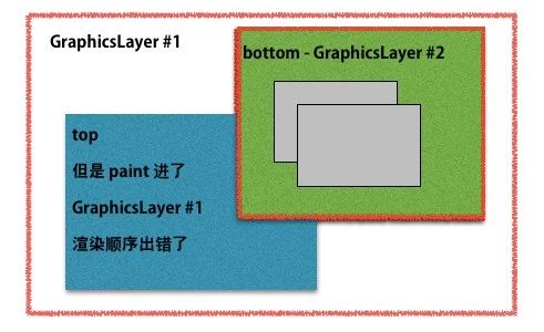 图中蓝色矩形覆盖在绿色矩形之上,同时它们的父元素是一个GraphicsLayer,假设绿色矩形也是一个GraphicsLayer,如果蓝色不是,那么它将和父元素公用一个合成层,既变成如下图情形。