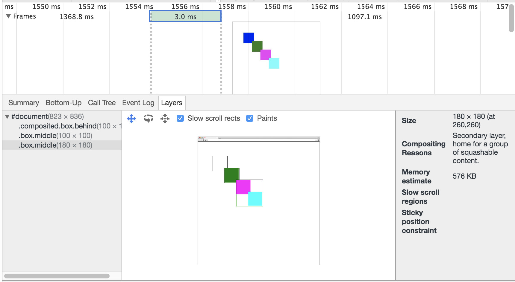 overlap引起的合成层提升经常出现,就会导致有很多的合成层,岂不是会造成内存大量浪费,所以Blink专门有Layer Squashing(层压缩)的处理。看一下demo(层压缩)。