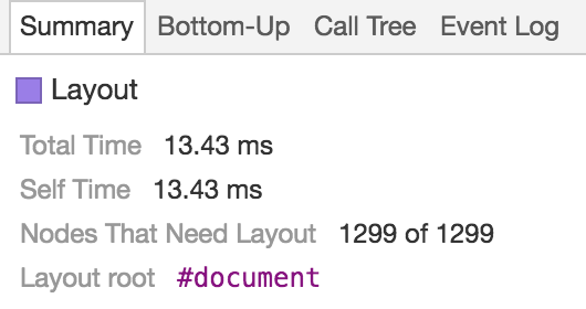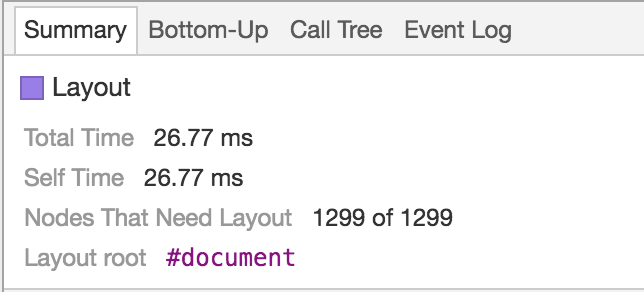 - Parse HTML. 新增的html会在这里被解析,生成对应DOM元素。大部分你会在page load和appendChild之类操作后见到它。