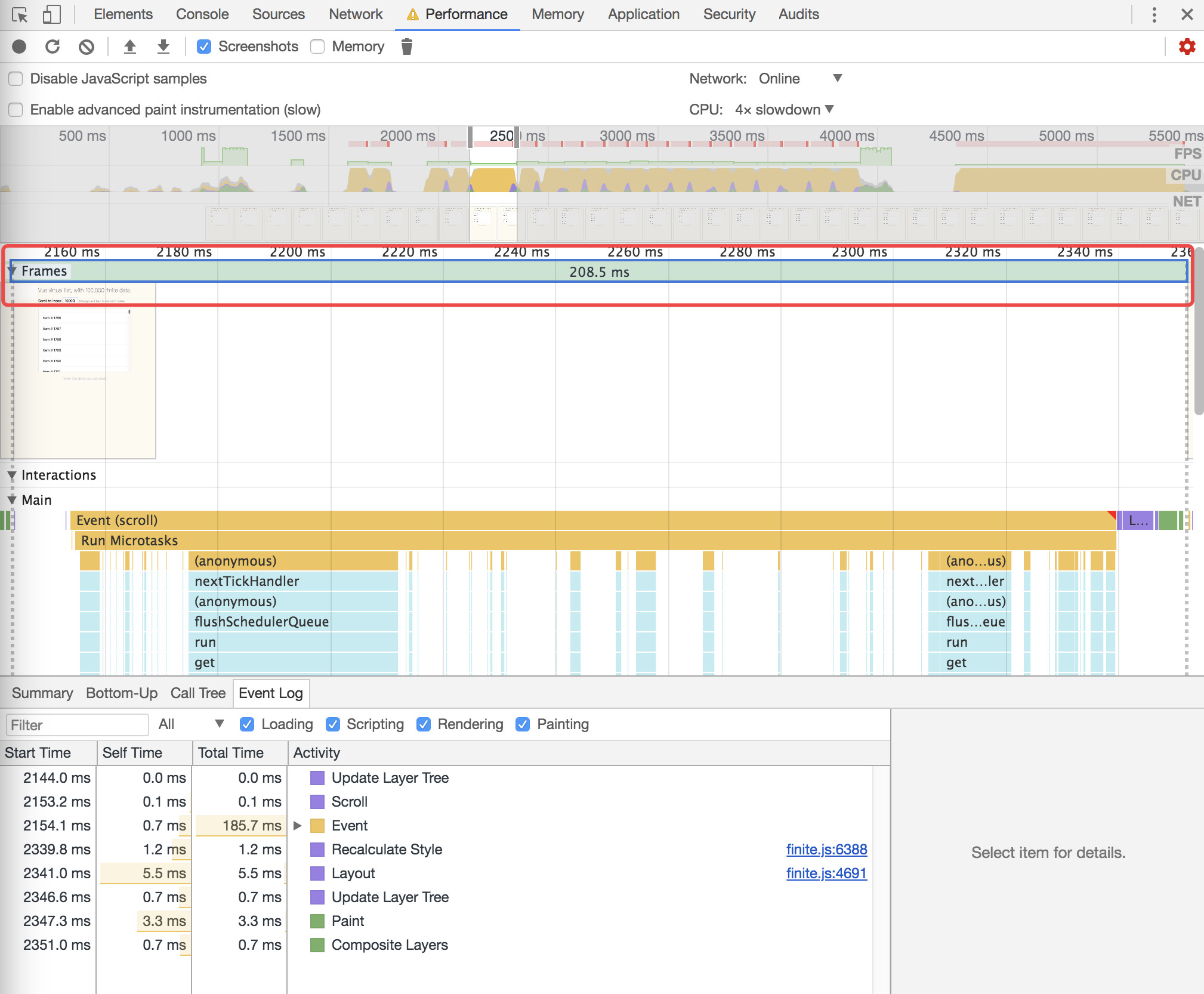 打开chrome开发者工具,切换到performance tab,点击record按钮,这时你对页面的操作就会被记录下来,点击stop后就能看到性能火焰图等信息了,点击Frames中的一帧,下方的Main区域就会集中到这一帧的运行过程,如下图所示。(红圈区域即为选中一帧)