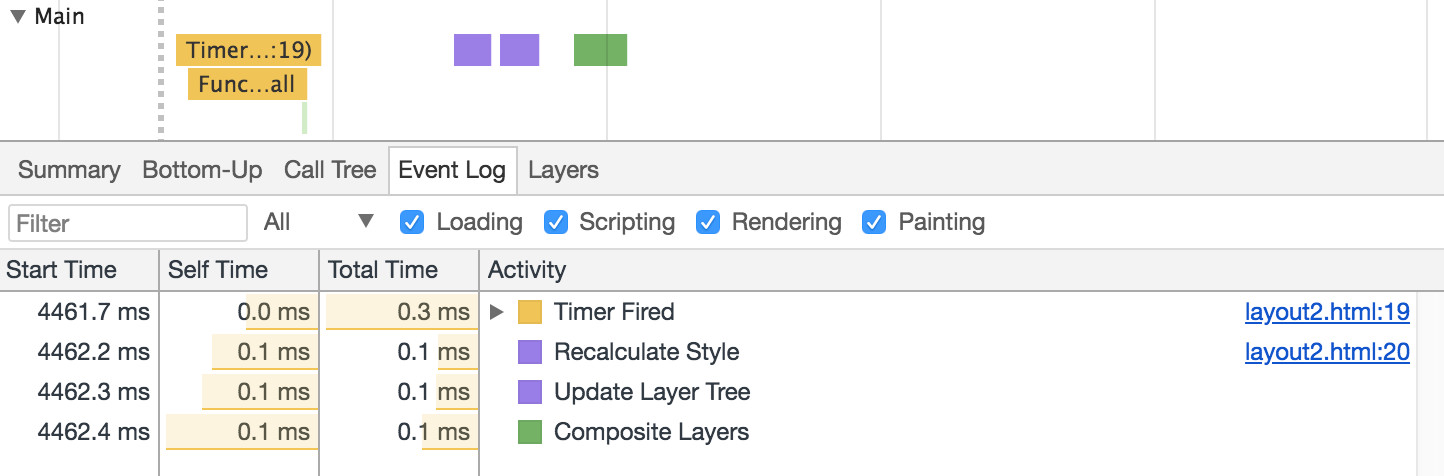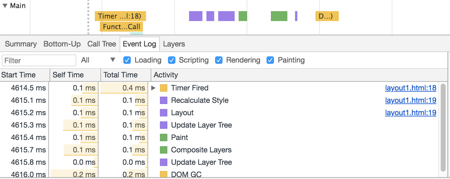 上面说的渲染的五个步骤中的每一个都有可能造成卡顿,当然根据css属性的不同,可能会跳过layout或者paint阶段(具体每个css属性影响哪些阶段,请查看css触发器,注意chrome现在用的是blink内核),那么如何知道页面runtime中触发了哪些步骤以及各自性能了,最好的方法就是使用chrome devtool中的performance来记录分析。