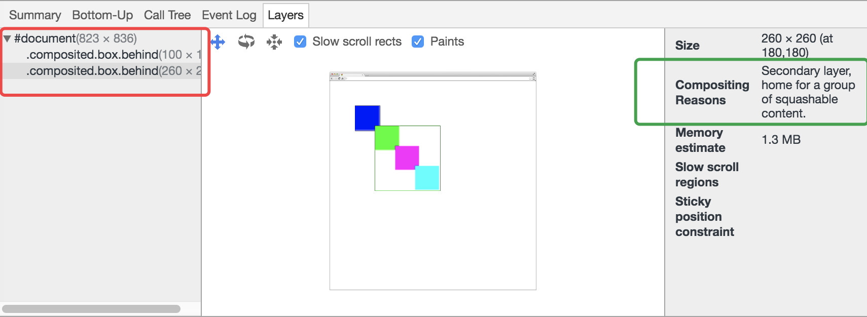 红色圈中部分是显示有几个合成层,右侧绿色圈中部分显示这个合成层形成的原因和大小等信息。很明显,中间可视区域的深蓝色的矩形因为开启3D加速的原因被提升为合成层,绿色,红色,浅蓝三个矩形因为overlap的原因被提升成了合成层。