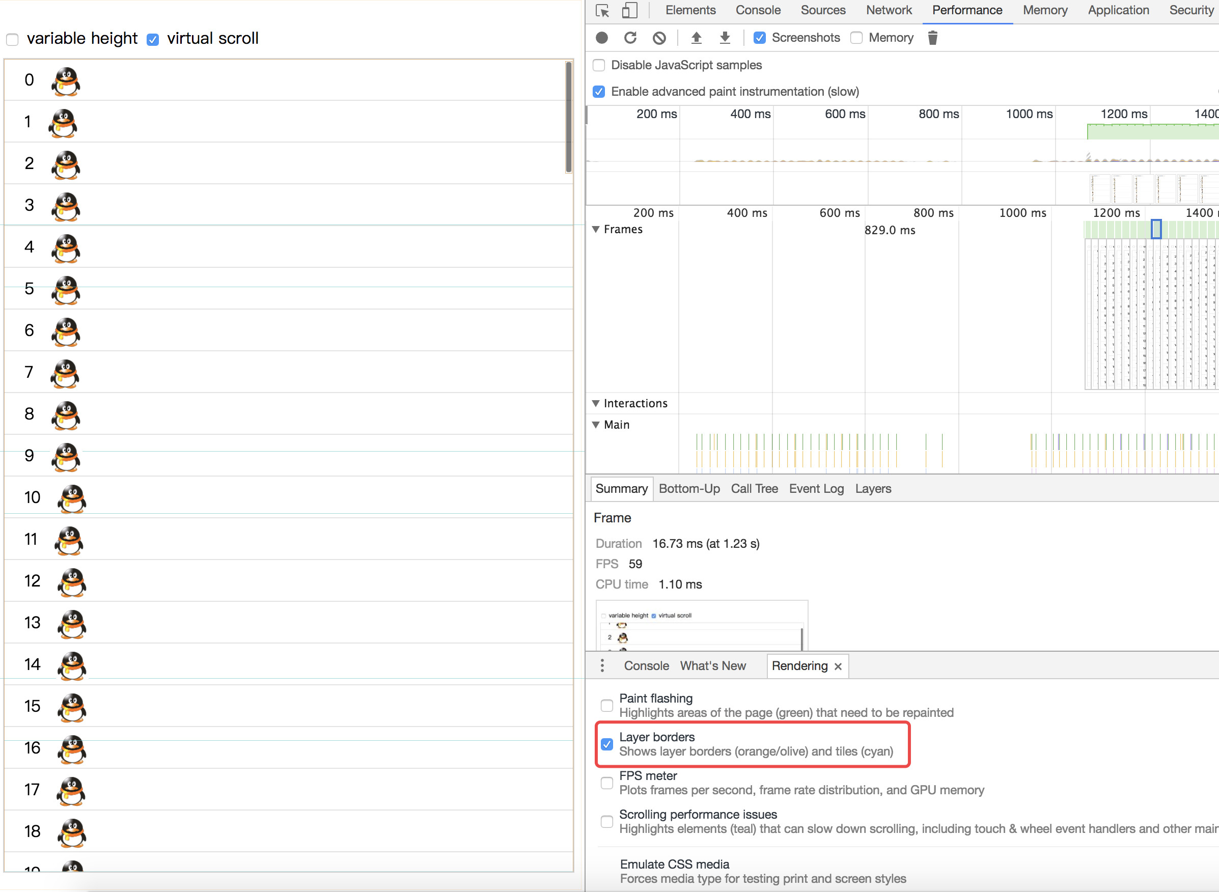打开chrome的Performance工具来分析,选中一帧后,会看到下方工具栏出现一个layer tab,选中这个tab就能看到页面对应的合成层信息。