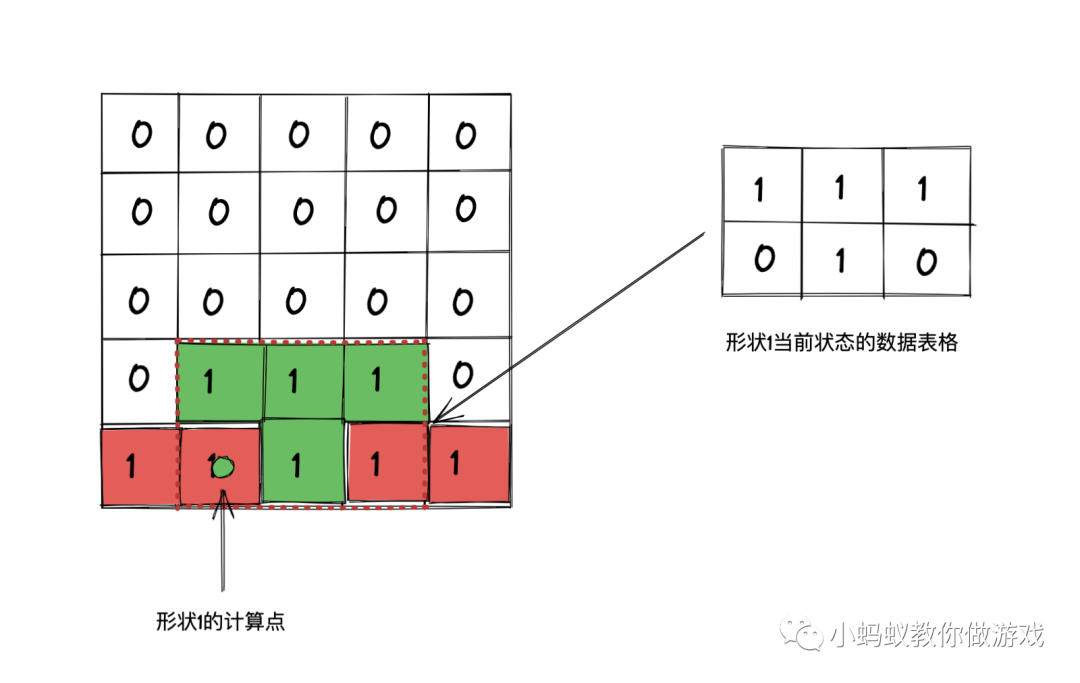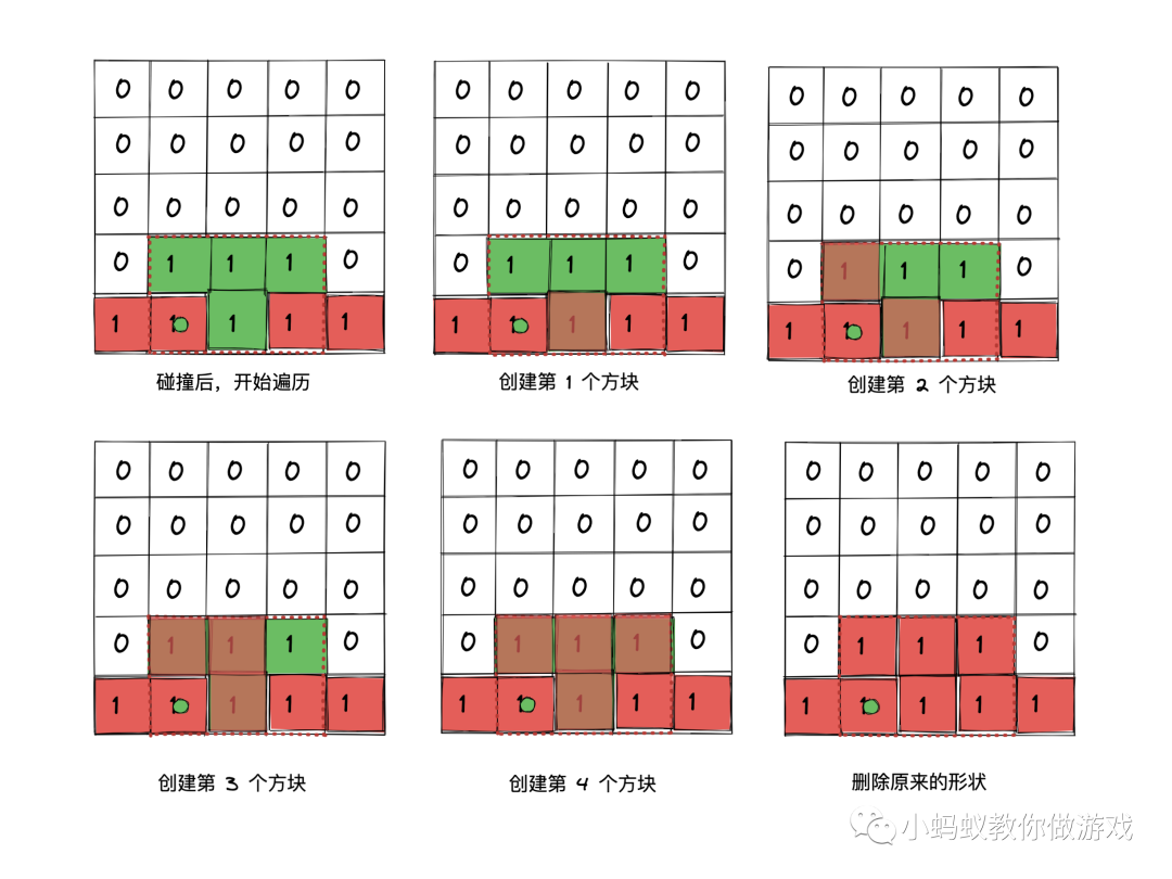 当形状发生碰撞后,首先计算出当前形状的的“计算点”在整个数据表格中的行号和列号,然后从“计算点”所在的行列号开始,依次遍历当前状态数据表格中的每一项,如果当前数据为 1 ,就在这个位置处创建一个新的方块,直到当前状态的数据表格遍历完成为止。最后,再将这个形状删除。