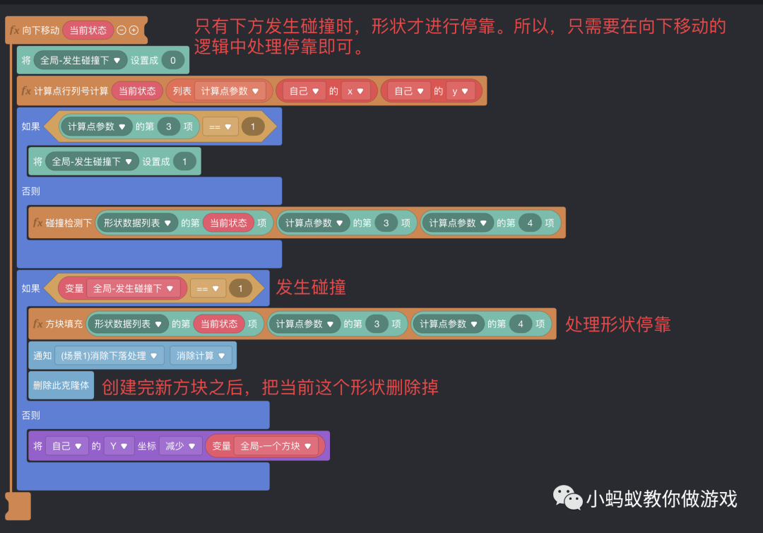 接下来,我们就来看一下形状停靠的逻辑实现。由于形状只在下方发生碰撞时才进行停靠,所以,我们只需要处理向下移动的逻辑即可。