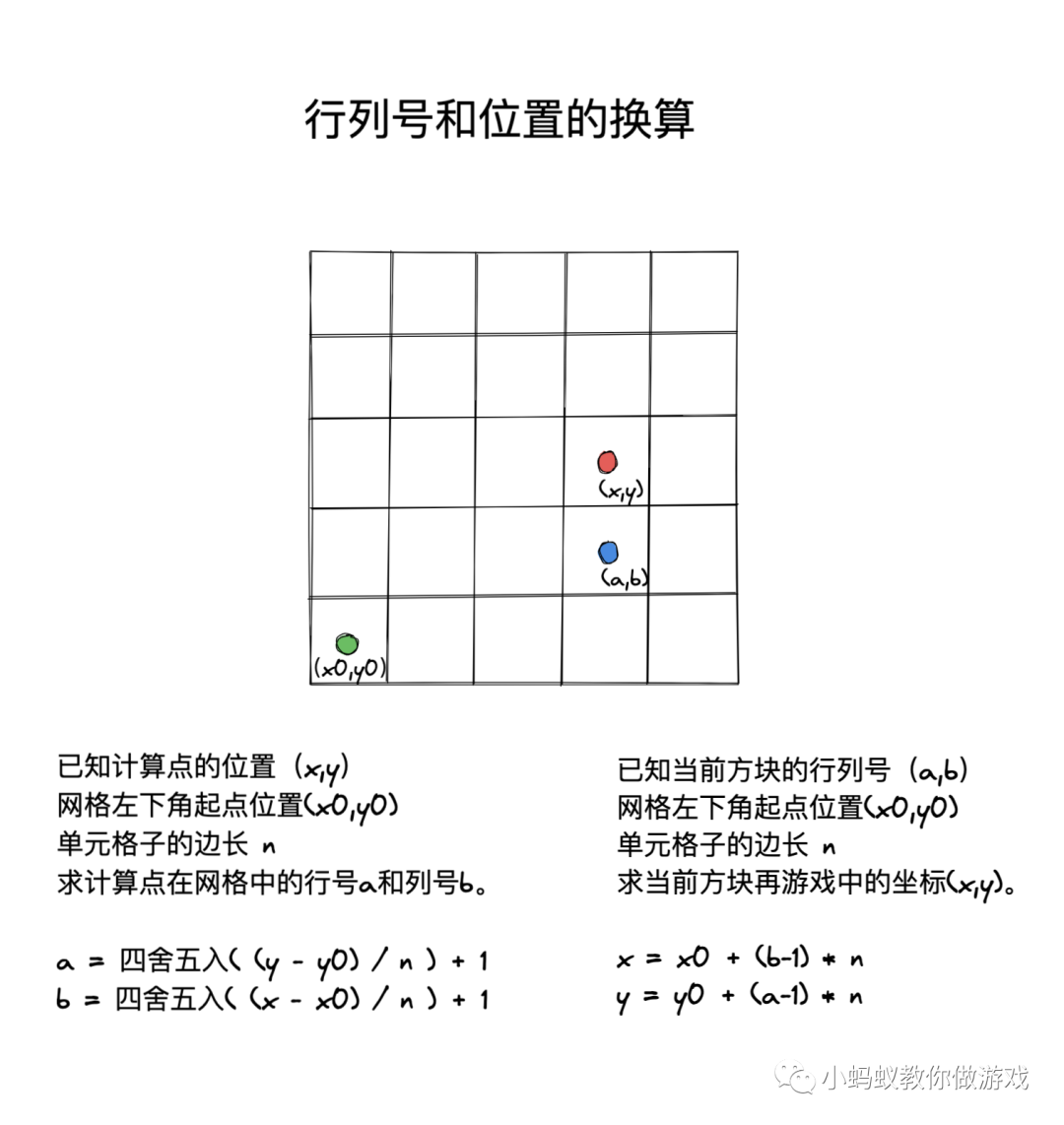 其中还涉及到行列号和位置的换算,公式在上面,就不再解释了。这个换算将表面上的游戏世界和背后的看不见数据表格连接起来,其实真正的计算和逻辑处理都是以背后的数据表格为基础的,背后的工作完成之后,再将得到的结果展现到游戏的界面上。