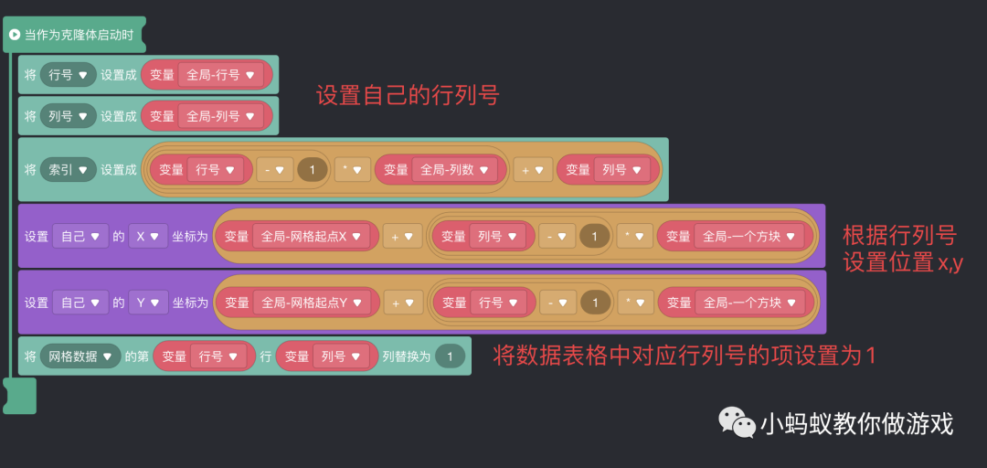 逻辑很简单,根据行号和列号设置自己在游戏世界中的位置,然后再在整个数据表格中自己对应的位置处设置为 1,表示当前的这个位置已经有方块填充了。
