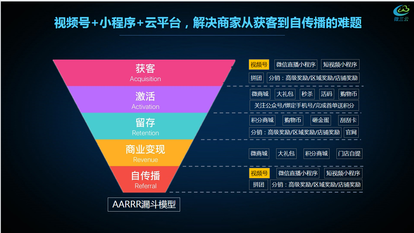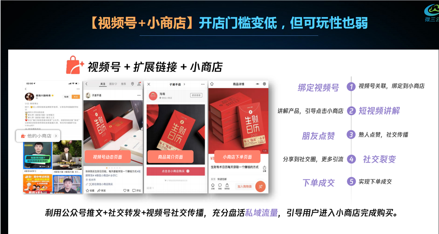 做好自己的视频号,用视频号为小商店引流。视频号既可以在微信生态的公域流量里去引流裂变,也可以在自己的社群里运营变现,做到这里就已经形成了引流和变现两个步骤。但是小商店之所以叫小商店,就是简单的交易小程序。没有任何营销模式的属性,连分销,团队分红,礼品卡,自提点,礼包。积分,拼团,等功能都是没有的小程序,很难形成用户自行裂变,用户引流,留存,会员升级,用户变现,会员推广。不适合于企业做商业模式,微商代理。团队推广分润等模式,