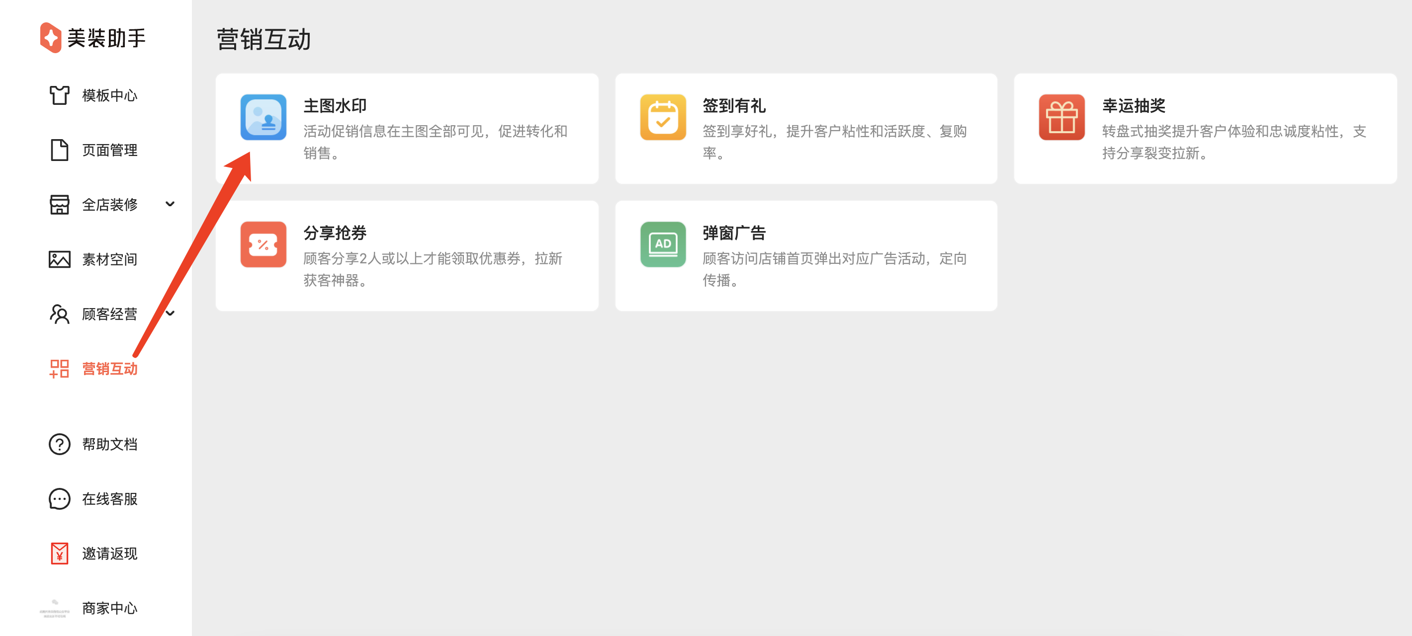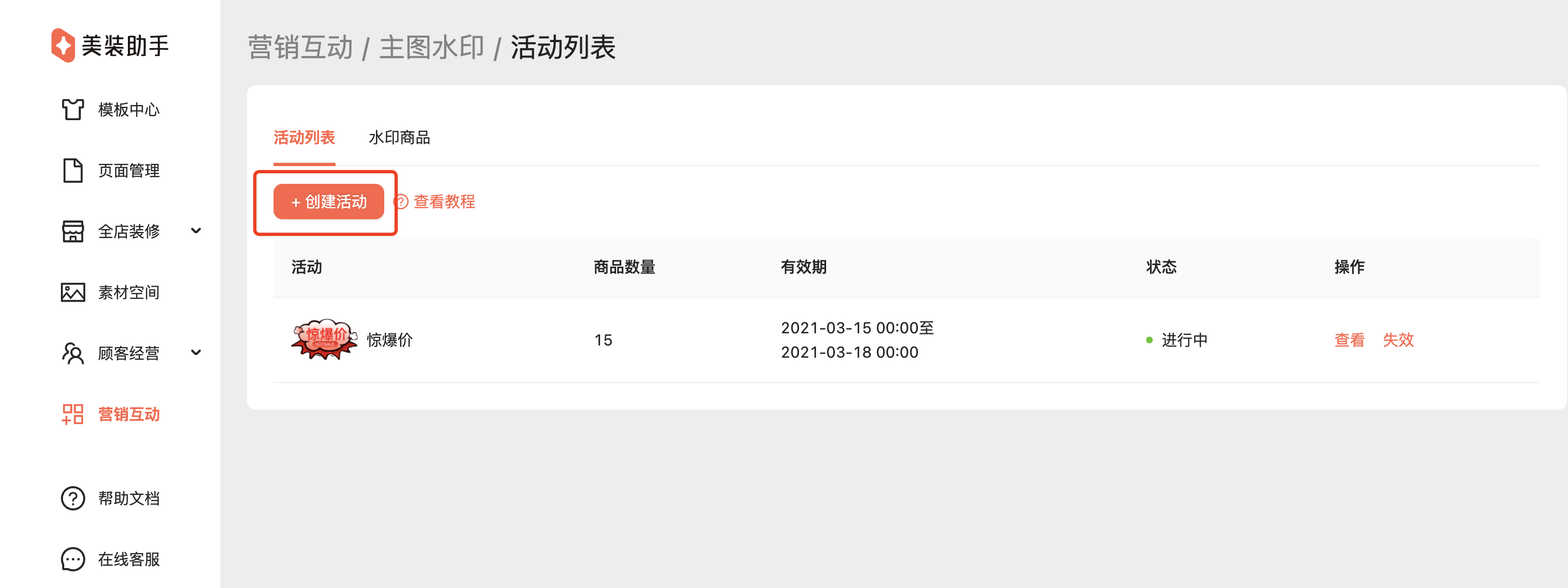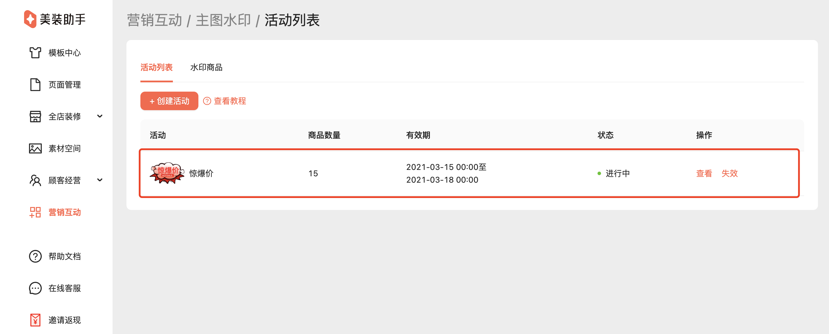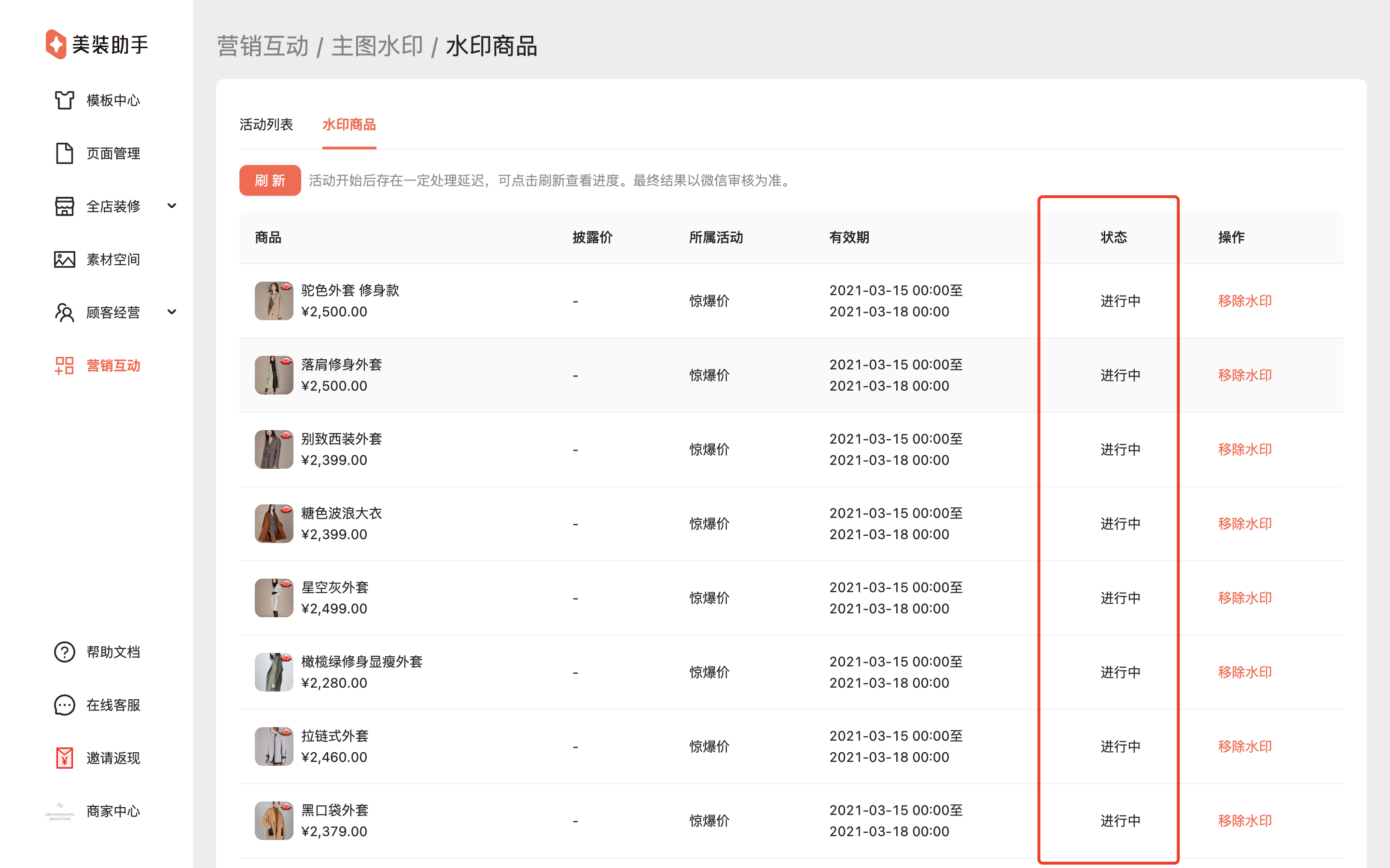 营销互动>主图水印>水印商品列表可以查看水印商品状态和操作水印。