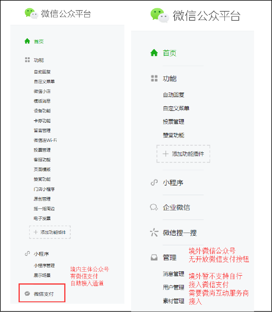 境内公众号有自助接入支付通道,境外公众号暂不支持自行接入。