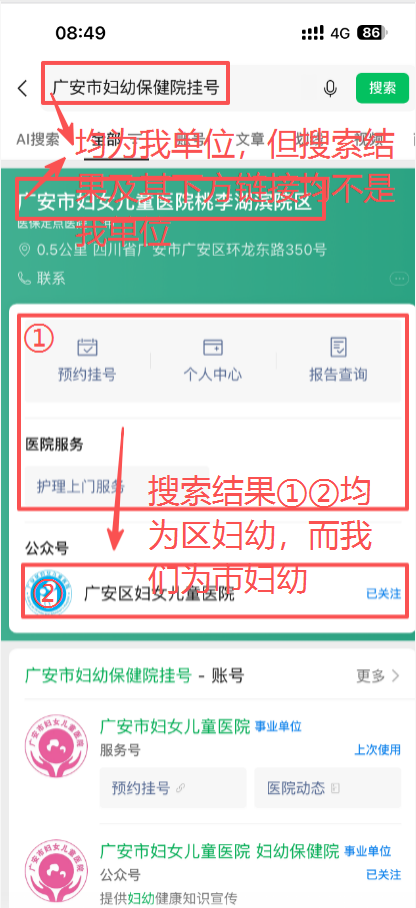经过群众及职工反映,微信搜索我院公众号/服务号信息后,微信显示的搜索结果信息:主体为广安市妇女儿童医院,但是下方所有的链接,包括预约挂号等均不是我院,而是与我院名称相近的广安区妇女儿童医院。该如何解决