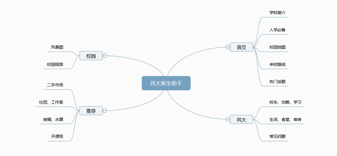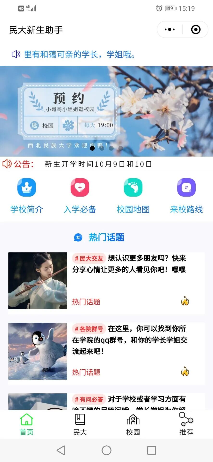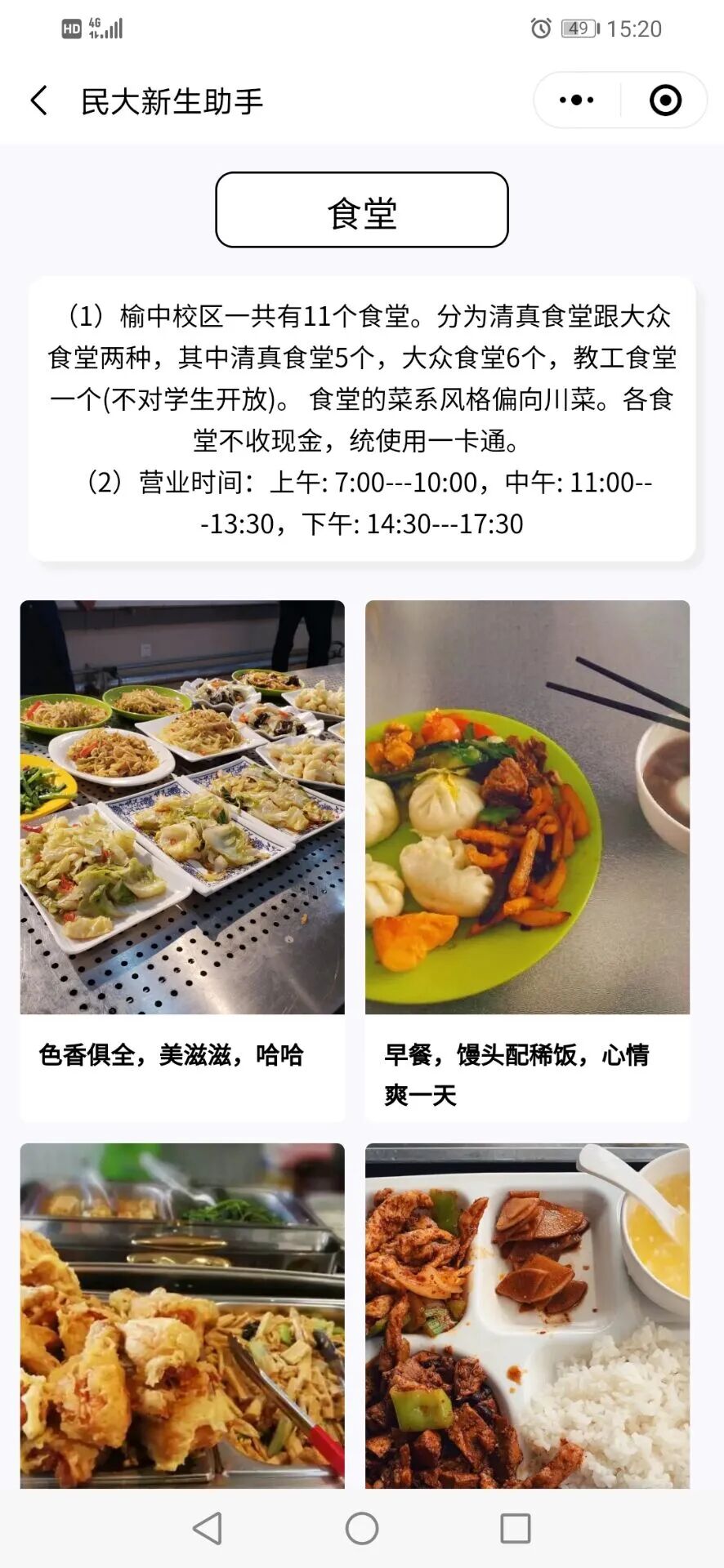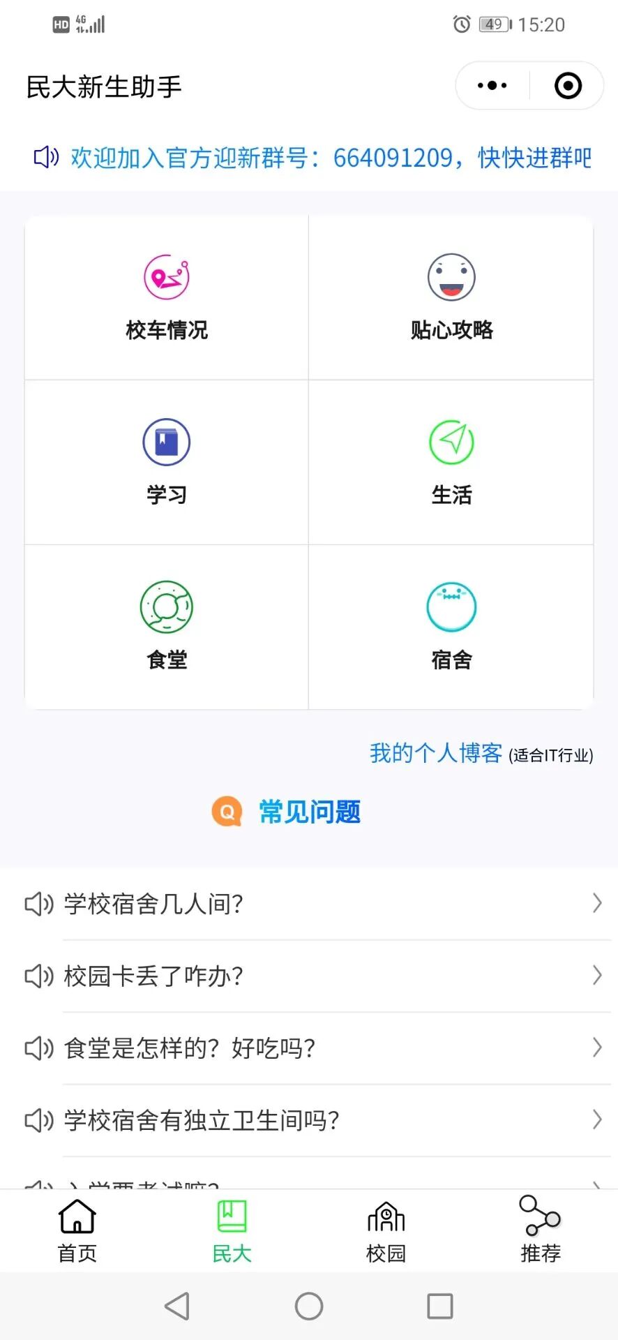 当大一新生录取时,刚到学校或者还没到学校时,对学校的概况是一无所知。每当开学季,群里面会出现新生问各种问题,如学校宿舍怎样、食堂如何、环境如何、校园卡在哪里领等问题。虽说群里会有热心的学长学姐回复,但是回复的内容也不是很完全,所以这款民大新生助手的主要功能就是展示宿舍、食堂、校园风景、视频、美食、商品转卖、各院群号,各社团群号,各省群号等信息,为大二大三的也提供了一定的服务,如上传社团、工作室、二手物品、电子商品、新生解答等服务。