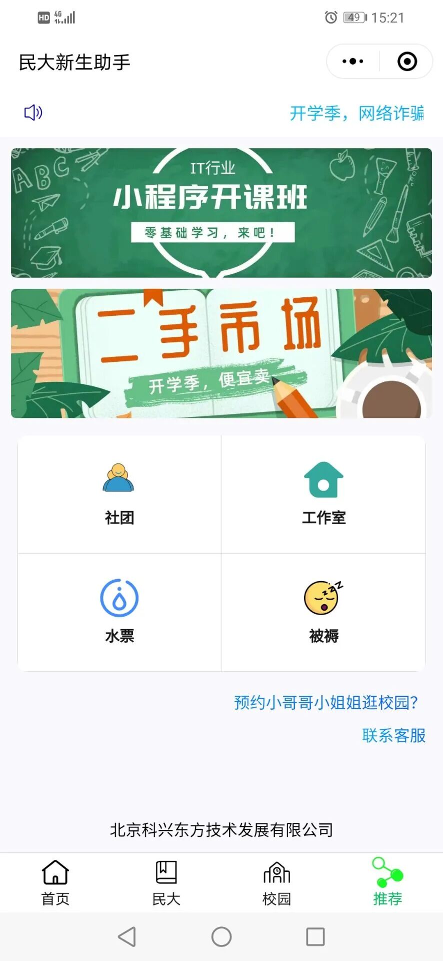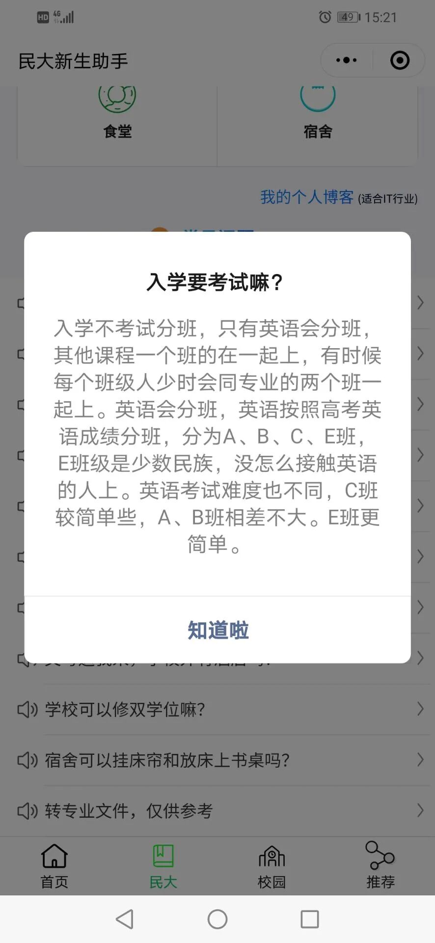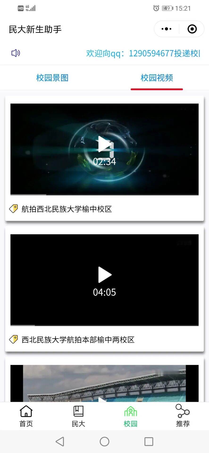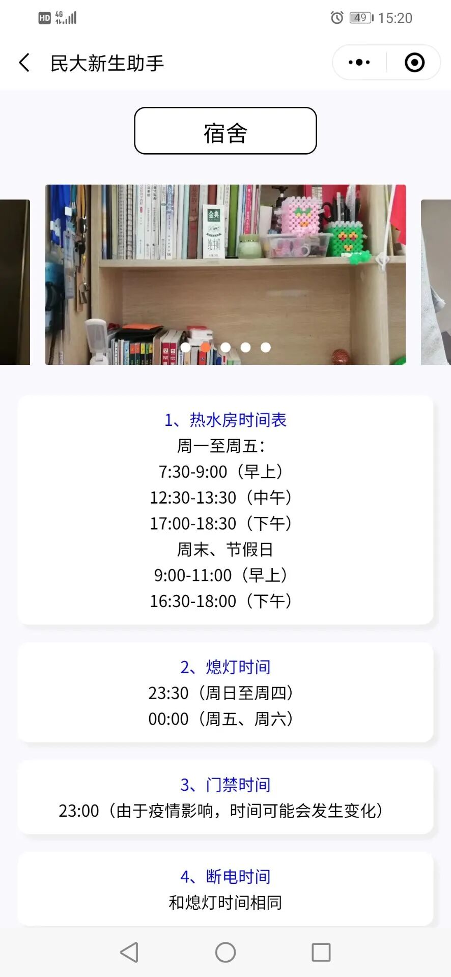 当大一新生录取时,刚到学校或者还没到学校时,对学校的概况是一无所知。每当开学季,群里面会出现新生问各种问题,如学校宿舍怎样、食堂如何、环境如何、校园卡在哪里领等问题。虽说群里会有热心的学长学姐回复,但是回复的内容也不是很完全,所以这款民大新生助手的主要功能就是展示宿舍、食堂、校园风景、视频、美食、商品转卖、各院群号,各社团群号,各省群号等信息,为大二大三的也提供了一定的服务,如上传社团、工作室、二手物品、电子商品、新生解答等服务。