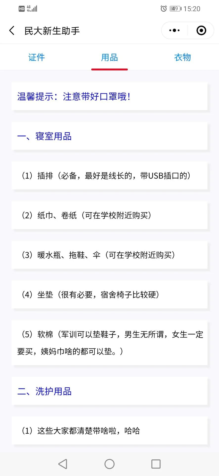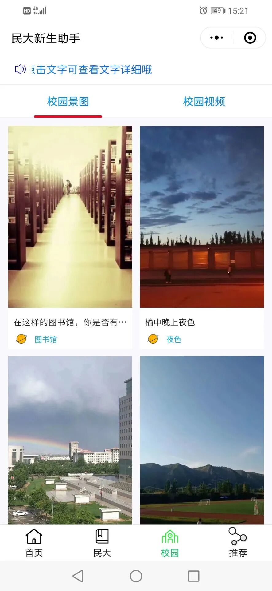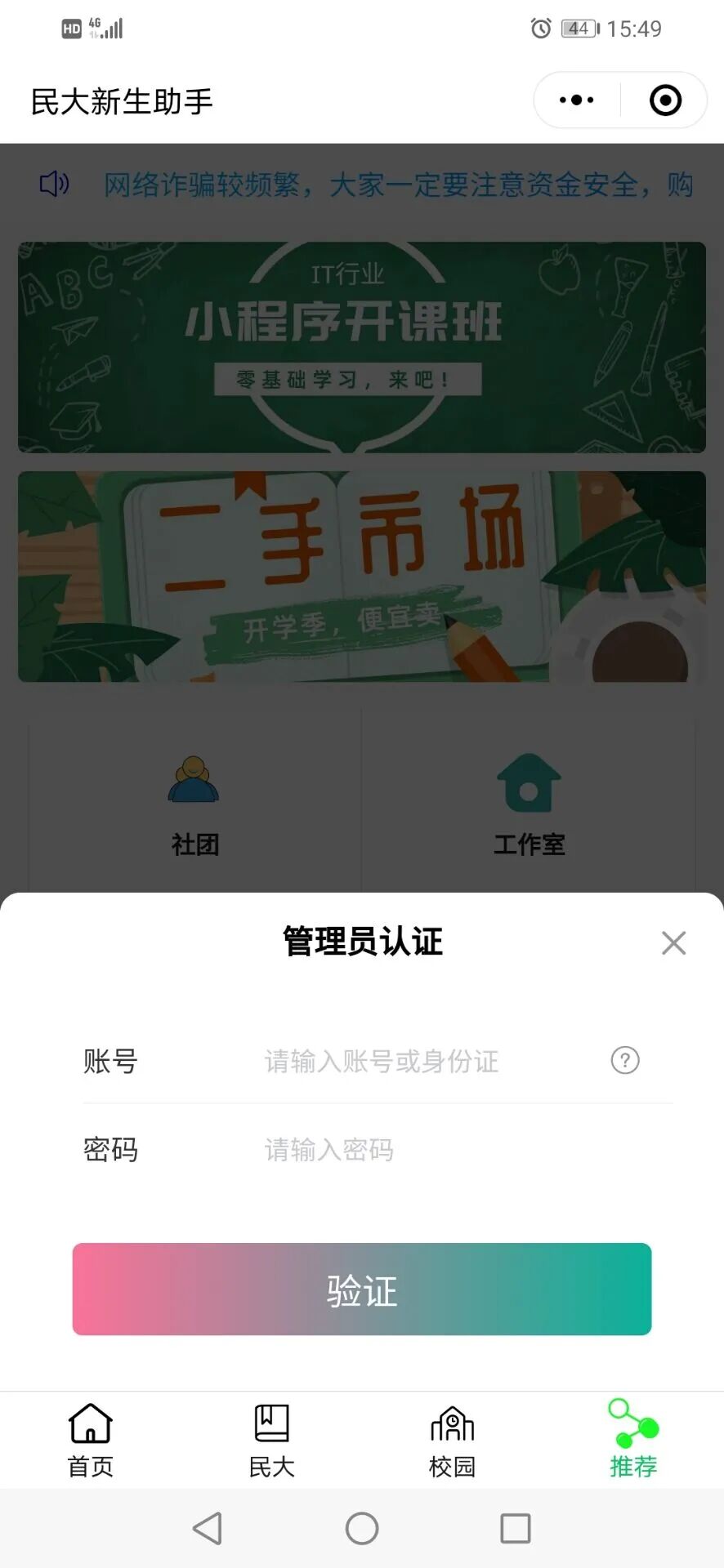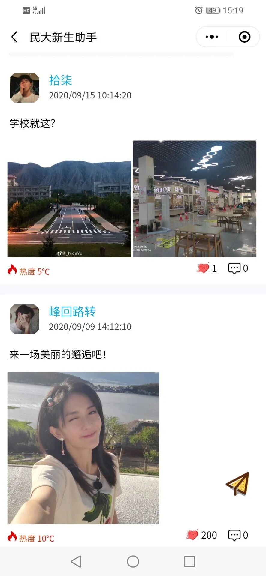 当大一新生录取时,刚到学校或者还没到学校时,对学校的概况是一无所知。每当开学季,群里面会出现新生问各种问题,如学校宿舍怎样、食堂如何、环境如何、校园卡在哪里领等问题。虽说群里会有热心的学长学姐回复,但是回复的内容也不是很完全,所以这款民大新生助手的主要功能就是展示宿舍、食堂、校园风景、视频、美食、商品转卖、各院群号,各社团群号,各省群号等信息,为大二大三的也提供了一定的服务,如上传社团、工作室、二手物品、电子商品、新生解答等服务。
