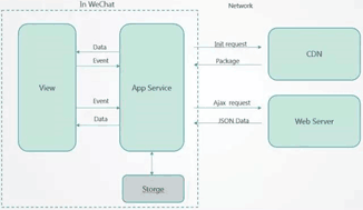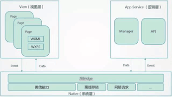 微信小程序的框架包含两部分View视图层、App Service逻辑层,View层用来渲染页面结构,AppService层用来逻辑处理、数据请求、接口调用,它们在两个线程里运行。视图层使用WebView渲染,逻辑层使用JSCore运行。视图层和逻辑层通过系统层的JSBridage进行通信,逻辑层把数据变化通知到视图层,触发视图层页面更新,视图层把触发的事件通知到逻辑层进行业务处理。