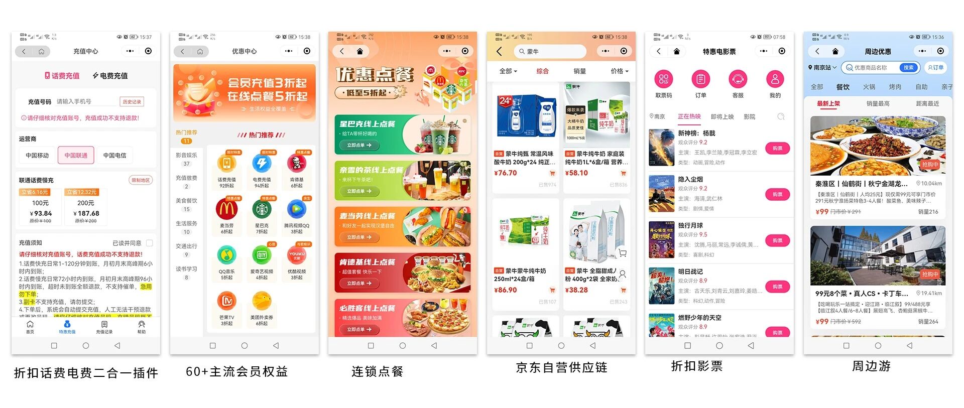 这几个插件分别涵盖了折扣话费电话充值、会员权益、在线点餐、京东自营供应链产品、周边游、电影票业务,最重要的是这么多个插件都是蚂蚁星球运营的,一个后台就可以管理多个插件的订单,省时省力,无接口费、不需要垫资,可以对接自己的会员体系。