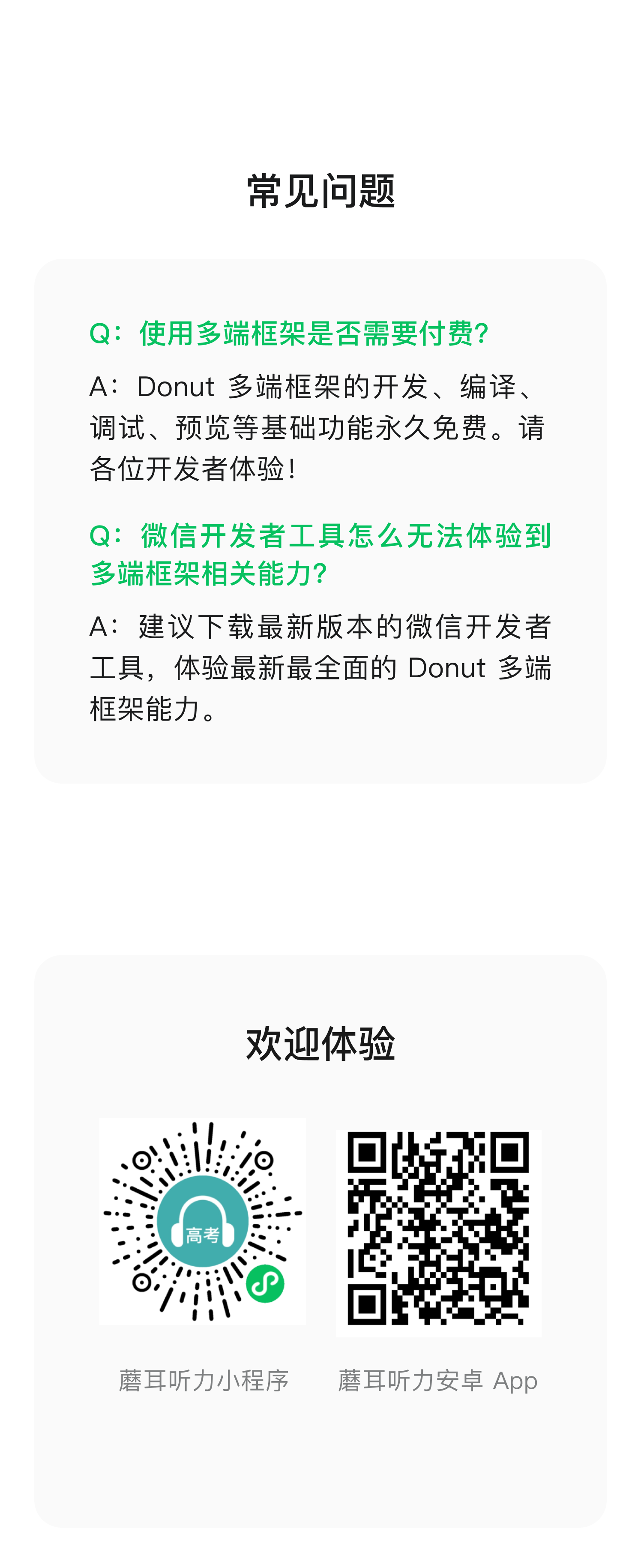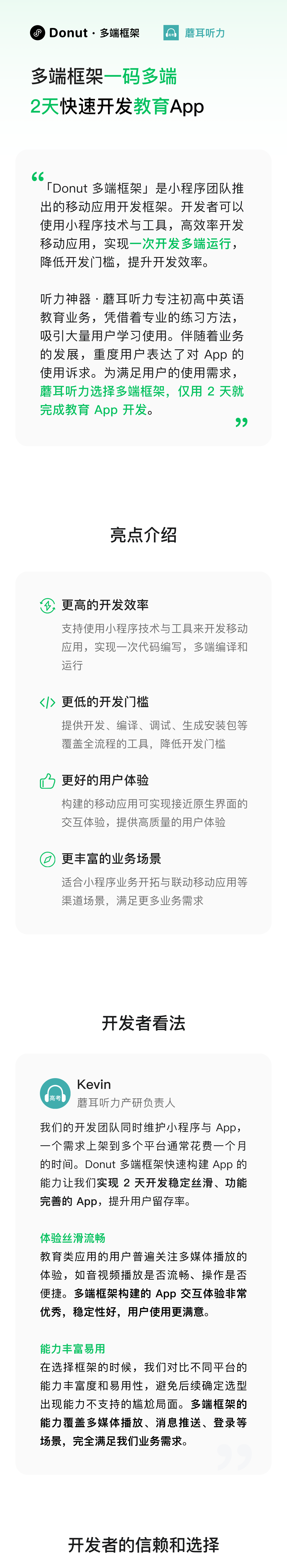 听力神器 · 蘑耳听力专注初高中英语教育业务。伴随着业务的发展,重度用户表达了对 App 的使用诉求。为满足用户的使用需求,蘑耳听力选择多端框架,仅用 2 天就完成教育 App 开发。