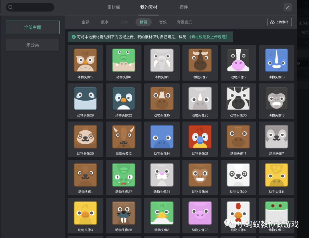 将下载下来的所有动物头像导入到素材库中。