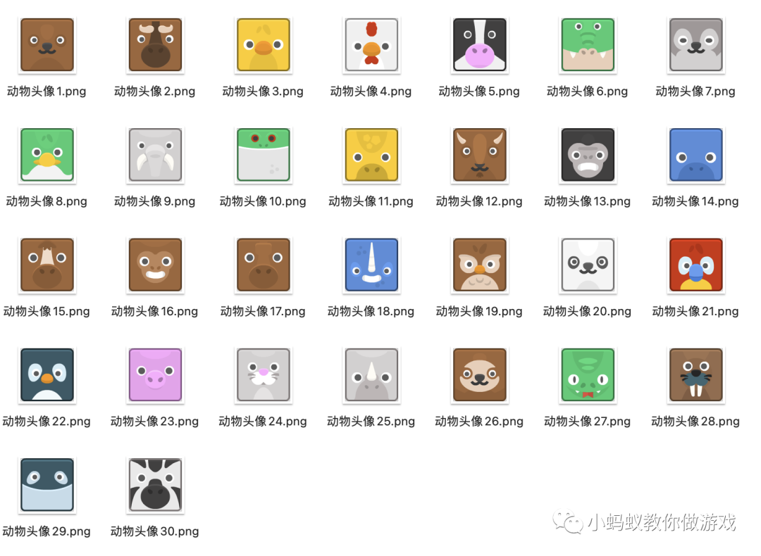 在实现之前,我们先准备一些素材。这里我给大家准备了 30 个可爱的动物头像,接下来我们将使用这些素材来制作完成一个动物连连看游戏。