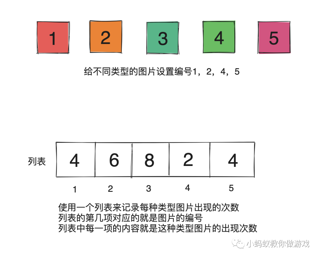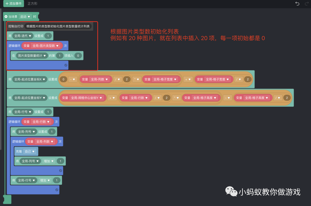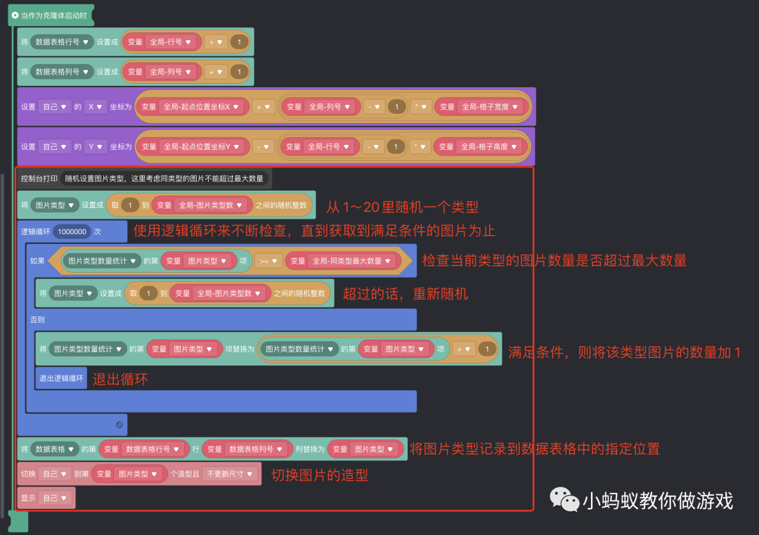 两个全局变量,一个用于设置图片的类型数,一个用于设置每种图片出现的最大次数。局部变量“图片类型”,记录的是当前图片的类型(编号),列表“图片类型数量统计”用于记录每种类型图片的出现次数。