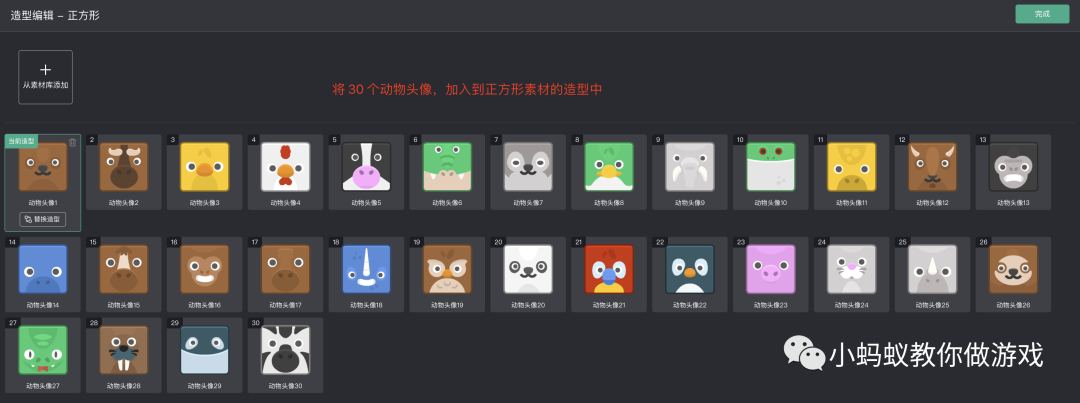 然后将 30 个动物头像,加入到正方形素材的造型中。