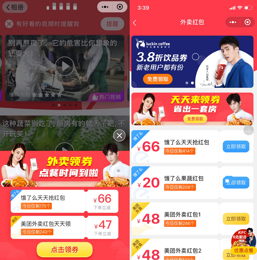 我们团队开发了一个外卖红包插件,集成美团、饿了么、肯德基、瑞幸等红包,可用在小程序,向我们申请使用就可以。