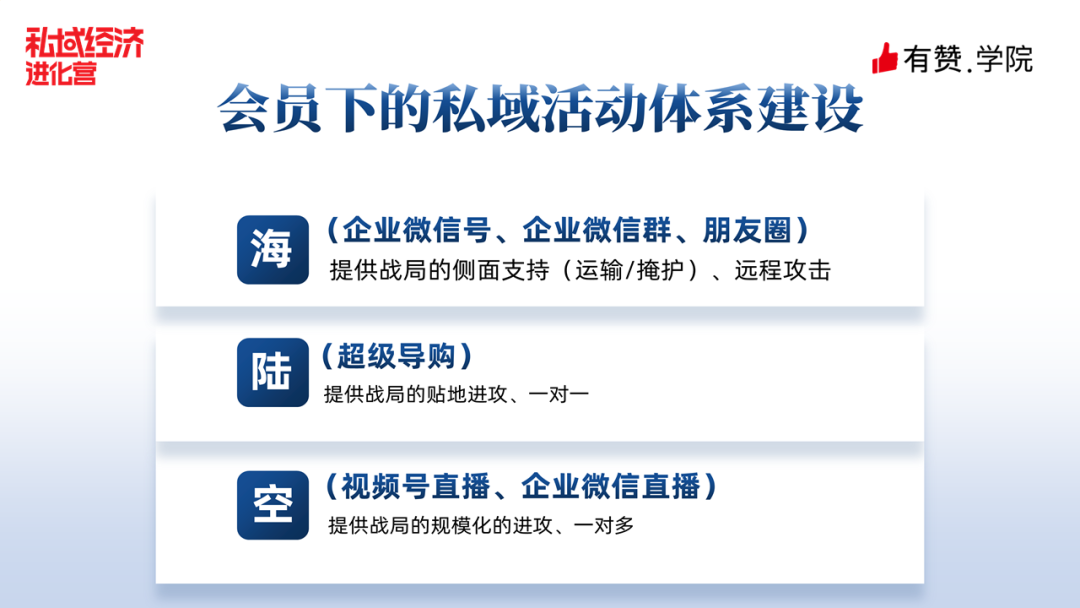 怎么打通呢?我们有一套会员下的私域活动体系建设。可以用一个很形象的比喻,“海陆空军团”。