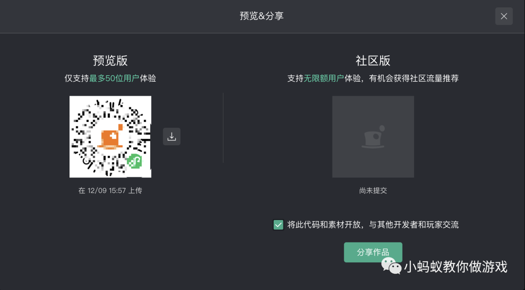 将会看到预览&分享的对话框,此时,使用你的手机微信扫描一下二维码,就可以在手机上体验游戏啦!