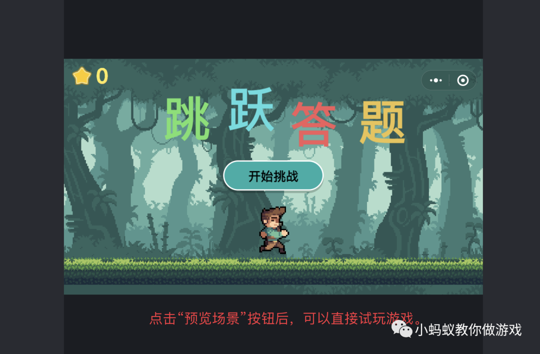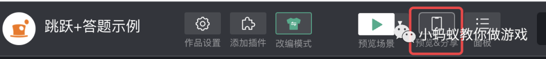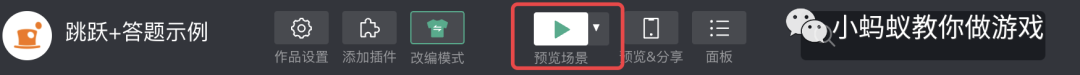 当你编辑完自己的题库后,就可以点击上方的“预览场景”按钮,运行一下游戏,可以直接在电脑上试玩一下游戏,检查一下你所编辑的题目在游戏中显示的是否正常。