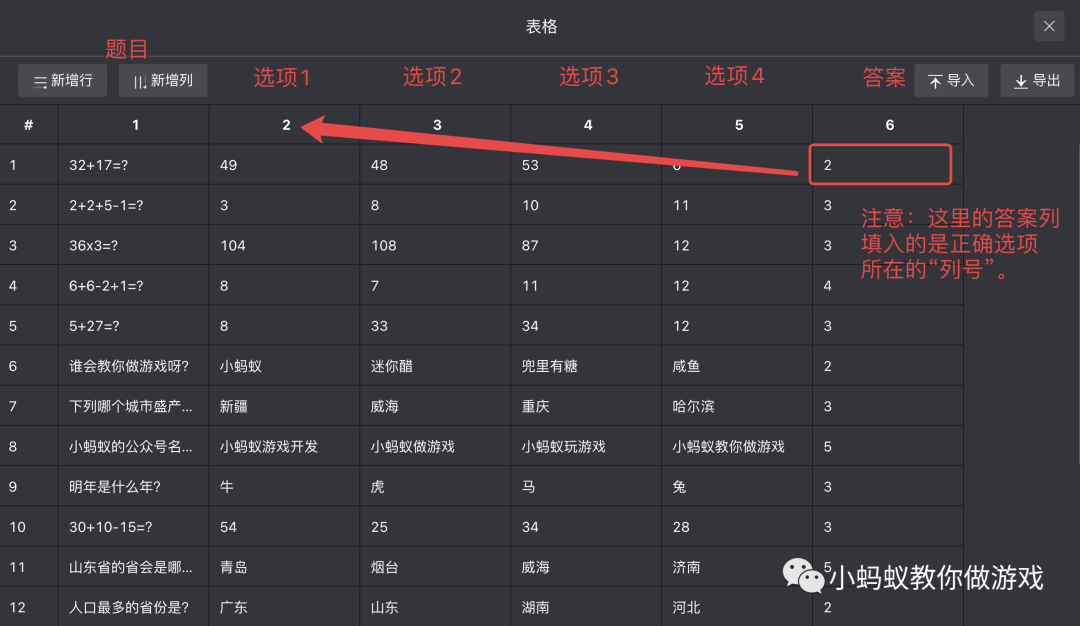 看起来是不是很熟悉,就跟我们平时常用的电子表格一样。这里只需要注意一点,就是题库表格的填写规范。如上图,第 1 列是“题目”,第 2~5 列,是对应的 4 个选项,然后第 6 列填入的是正确答案所在的列号。
