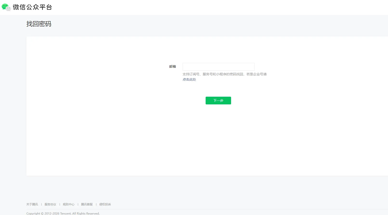 可通过账号绑定邮箱重置,入口:https://mp.weixin.qq.com/acct/resetpwd?action=send_email_page&token=&lang=zh_CN