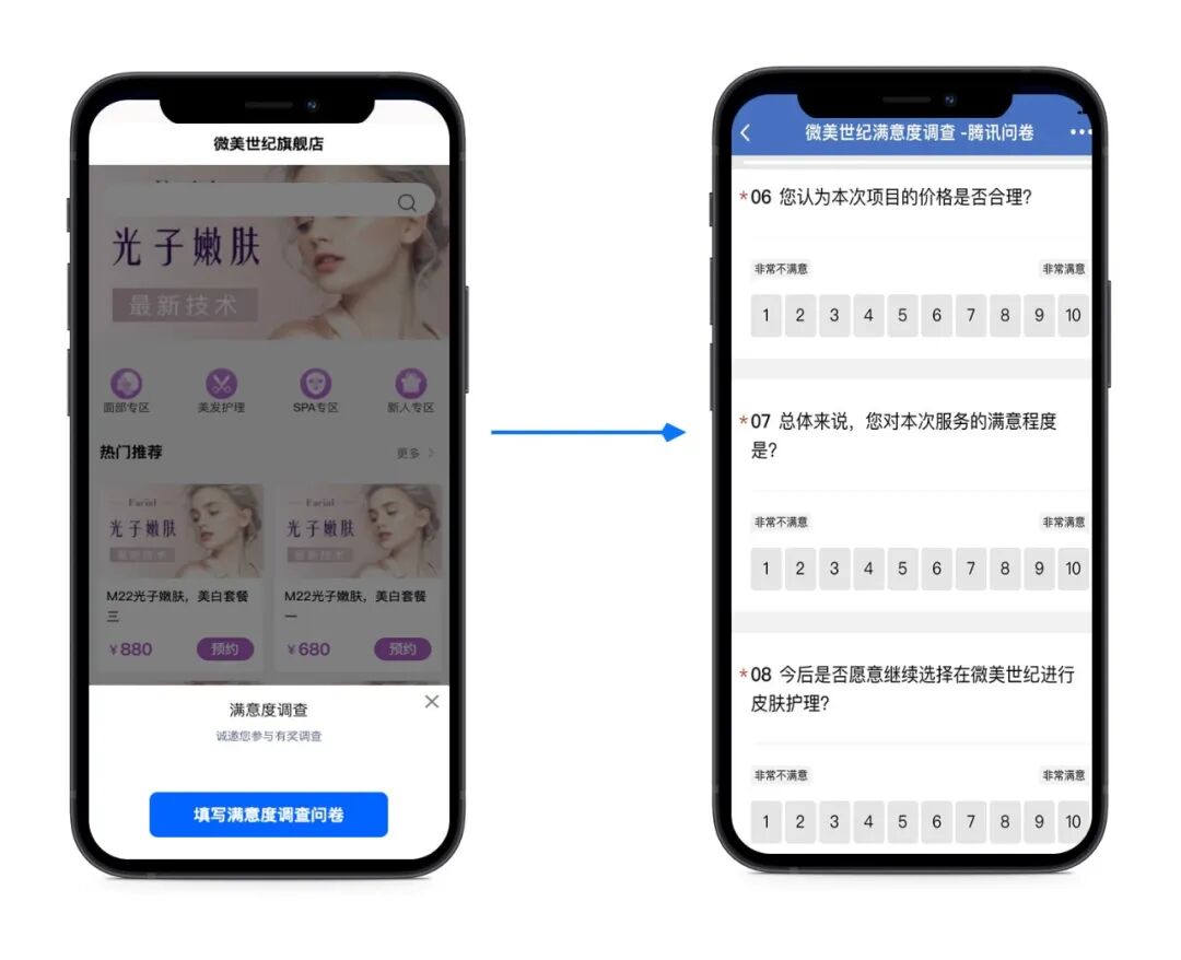 腾讯问卷与腾讯云微搭联合后,开发者通过微搭平台即可在小程序中嵌入问卷模块,直接调用问卷能力进行满意度调查的投放。