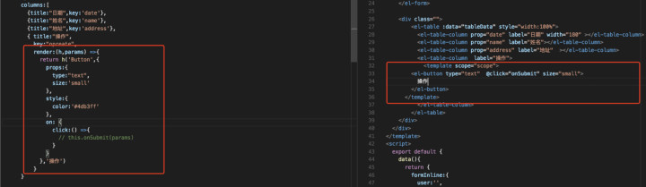表格 操作列 自定义渲染的时 ,iview 使用的是 vue的 render 函数, element 直接在template 中插入对应模板