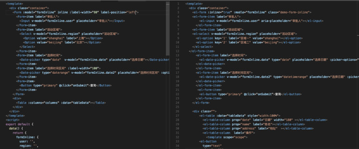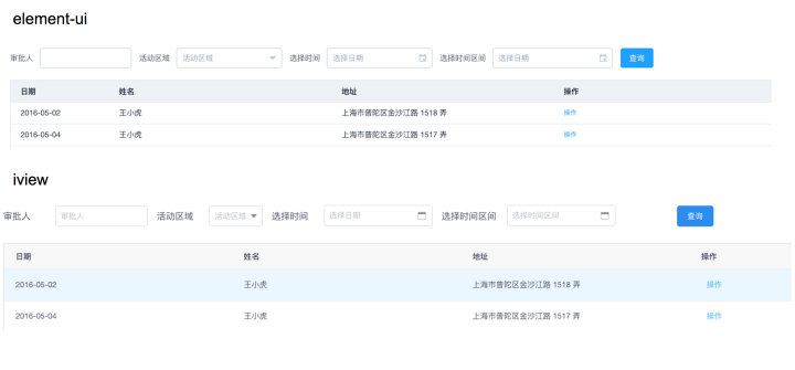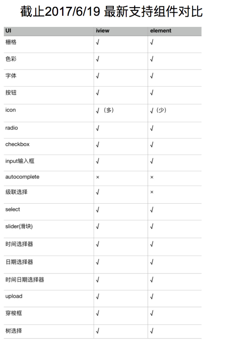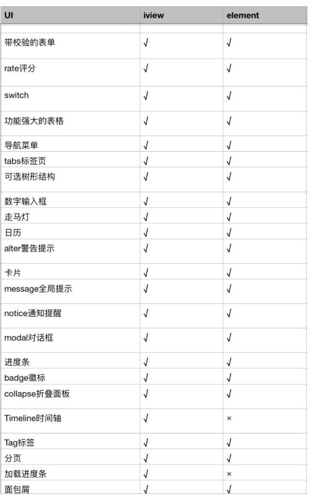 明显感觉 iview 的api 更加简洁,在生成类似表格 下拉框这些较复杂的组件时 , iview 的方式类似于antdesign , 好处是直接传数据进去,在内部实现了模板生成,高效 快捷。 而element 则是用到到v-for vue指令结合的方式去生成,批量生成元素。