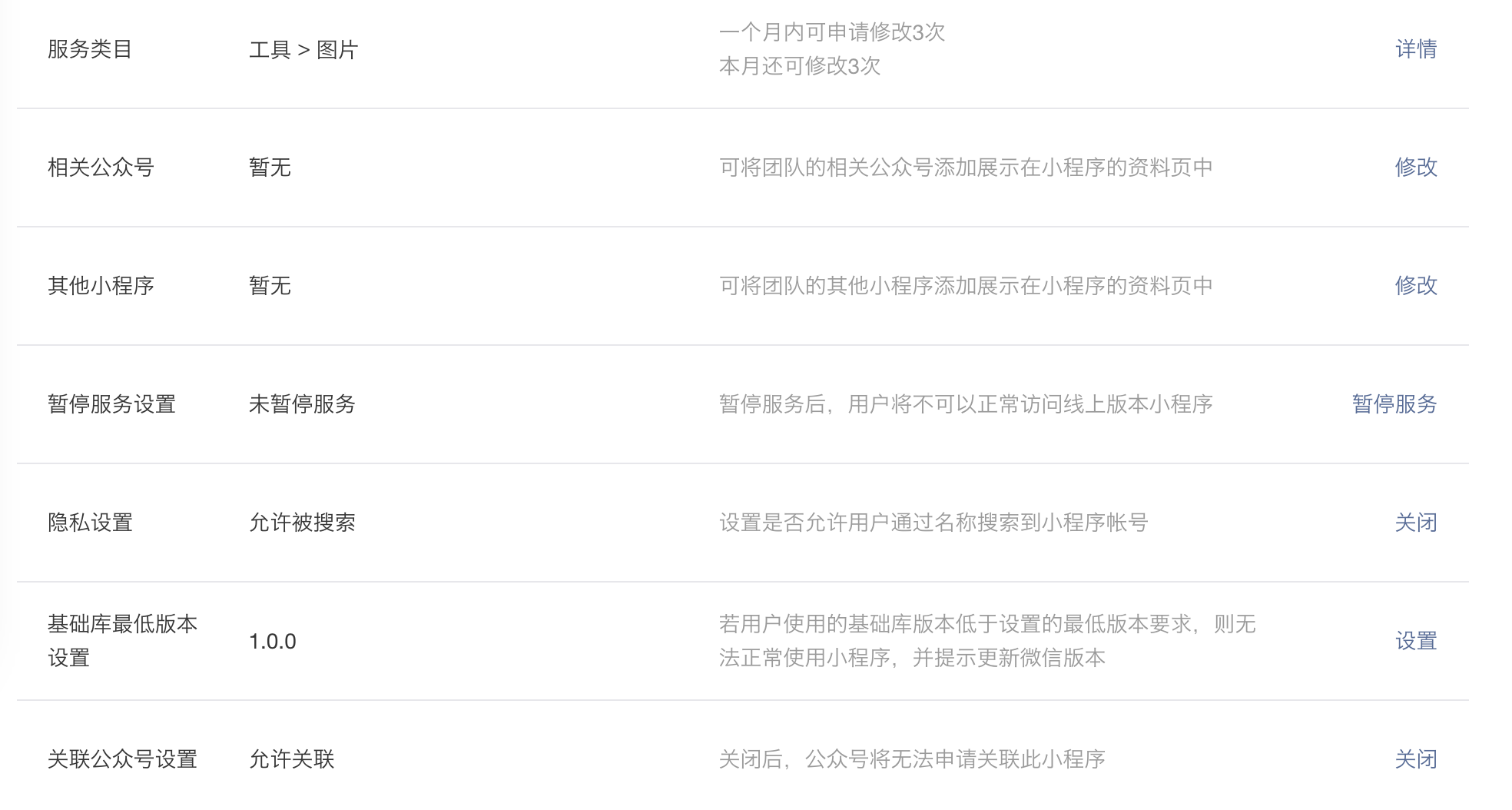 小程序设置都是正常的,如下图,都是正常的设置。不知道为什么会搜索不到。