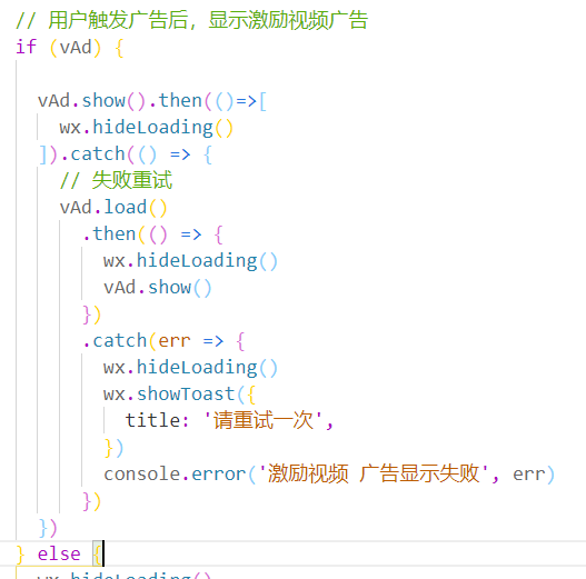 经实践,发现第一次调用vAd.show()时,通常会失败,此时,可参考模板中的示例代码,进行第二次加载。代码如下: