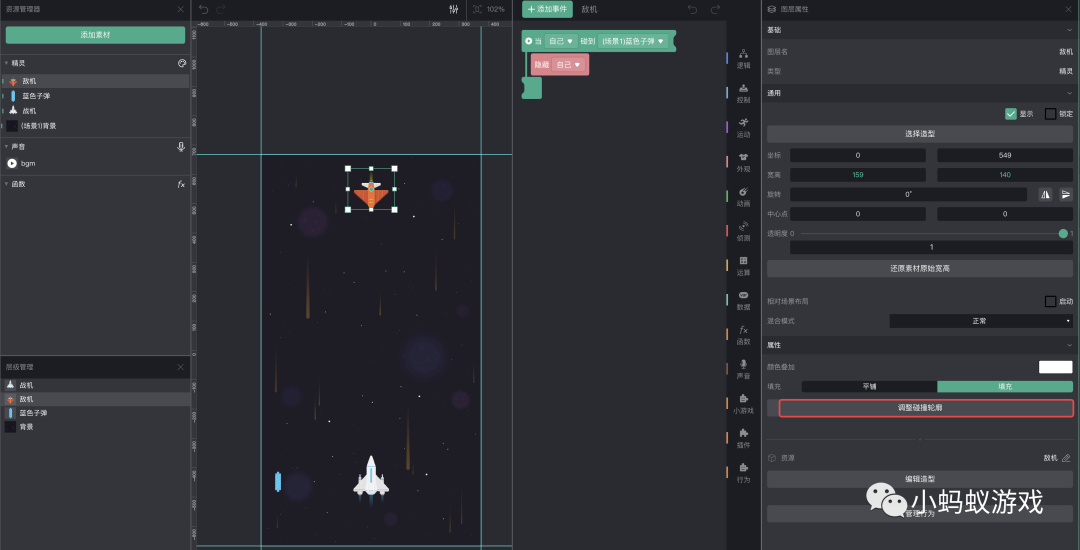 在“图层管理”中选中“敌机”,然后在“图层属性”中点击“调整碰撞轮廓”按钮。